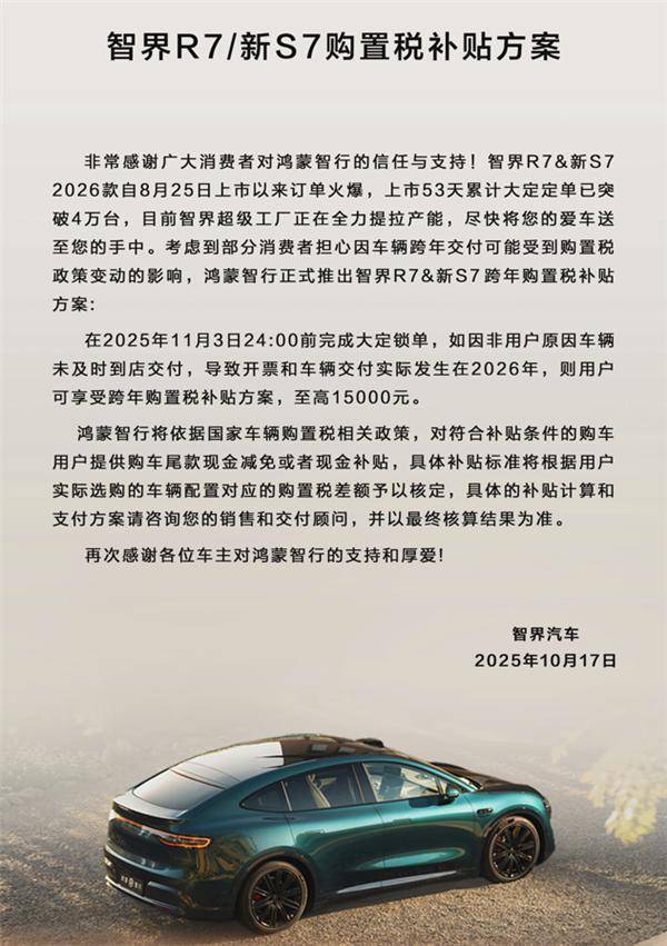 考虑到部分消费者担心因车辆跨年交付可能受到购置税政策变动的影响,鸿蒙智行正式推出智界R7&新S7跨年购置税补贴方案: